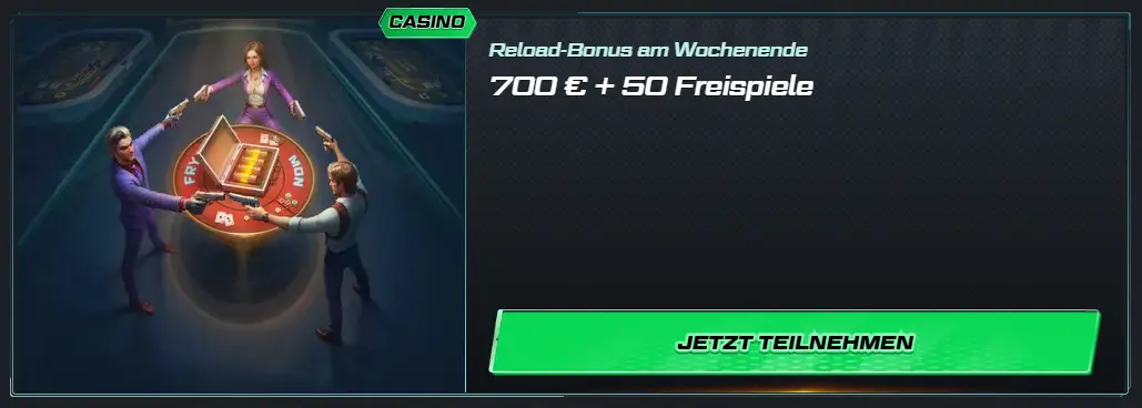 Einschätzung: Mit bis zu 700 € liegt dieser Reload-Bonus über dem Marktdurchschnitt für wiederkehrende Aktionen. Die Umsatzbedingungen entsprechen dem Willkommensbonus – wer diesen bereits erfolgreich freigespielen konnte, kennt den Aufwand. Das Angebot richtet sich klar an Spieler mit höheren Einzahlungen ab 50 €.